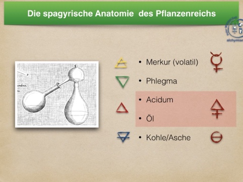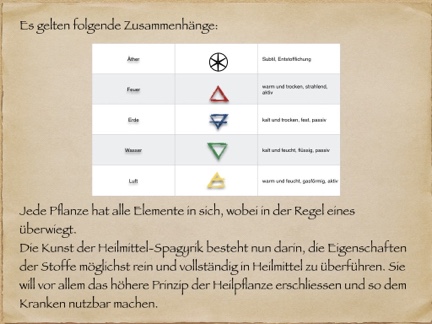 Aber auch die Gewinnung der 5 Elemente: Wasser, Feuer, Luft, Erde und Quintessenz ist aus der Pflanze möglich.