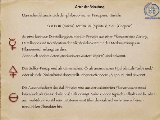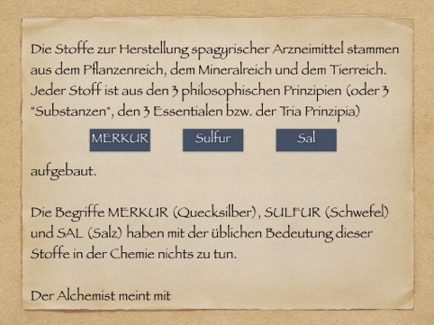 Alles in der Natur ist aus drei Prinzipien aufgebaut, so auch die Materie, die in der Alchymie Ausdruck eines höheren geistigen Prinzips ist. Diese drei Prinzipen werden in der Alchymie Merkur, Sulfur, Sal genannt und sind als Worte quasi „Platzhalter“ für multidimensionale Prinzipien, auch drei Essentiale oder Tria Prinzipia genannt. Es ist nicht mineralischer Schwefel oder metallisches Quecksilber gemeint und auch nicht Kochsalz, wenn man von Sulfur (Schwefel), Merkur (Quecksilber), Sal (Salz) in der Alchymie spricht, auch wenn sie repräsentativ diese Prinzipien materiell ausdrücken.