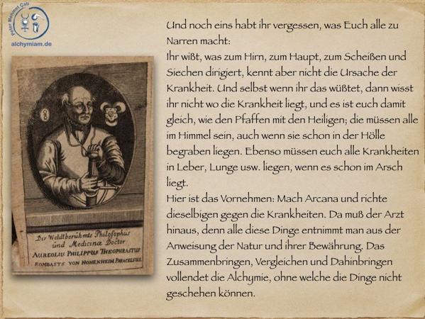 Eine fundierte Ausbildung in den Naturgesetzen und wirksame Heilmittelbereitung wäre Vorausetzung, bevor „Mediziner“ auf Menschen losgelassen werden. Auch dies mukierte schon Paracelsus. Heutzutage ist die Alchymie noch unbekannter und das Verständnis der Natur völlig verloren gegangen.