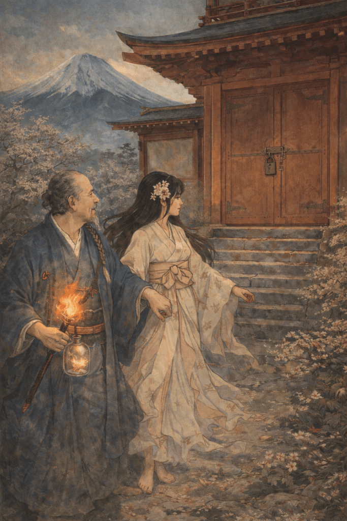 「危険なしに得るものは」と彼女は付け加えた。「栄光なき勝利に等しいのです。去る前に一つだけ言っておきましょう。この神殿の入口を守る怪物は、**天之瓊矛(Ame no Nuboko)**によってのみ倒すことができます。普通の火で赤熱させ、その身体を貫き、心臓へと達しなければなりません。これは、古代の人々によってよく描写され、多く語られてきた存在です。」